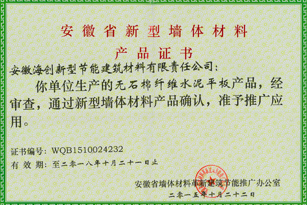 ? ? 為打造海螺板業(yè)品牌形象,增強品牌影響力,經(jīng)過(guò)近半年的準備和實(shí)施,先后歷經(jīng)省市兩級專(zhuān)家組現場(chǎng)調研、工藝資料審查、現場(chǎng)實(shí)物檢測,以及安徽省革新建筑節能推廣辦公室專(zhuān)家組會(huì )議復核評審論證等程序,安徽海創(chuàng )新材料公司所生產(chǎn)的無(wú)石棉纖維水泥平板產(chǎn)品終獲省新型墻體材料認證,并取得新型墻體材料產(chǎn)品認證證書(shū)。